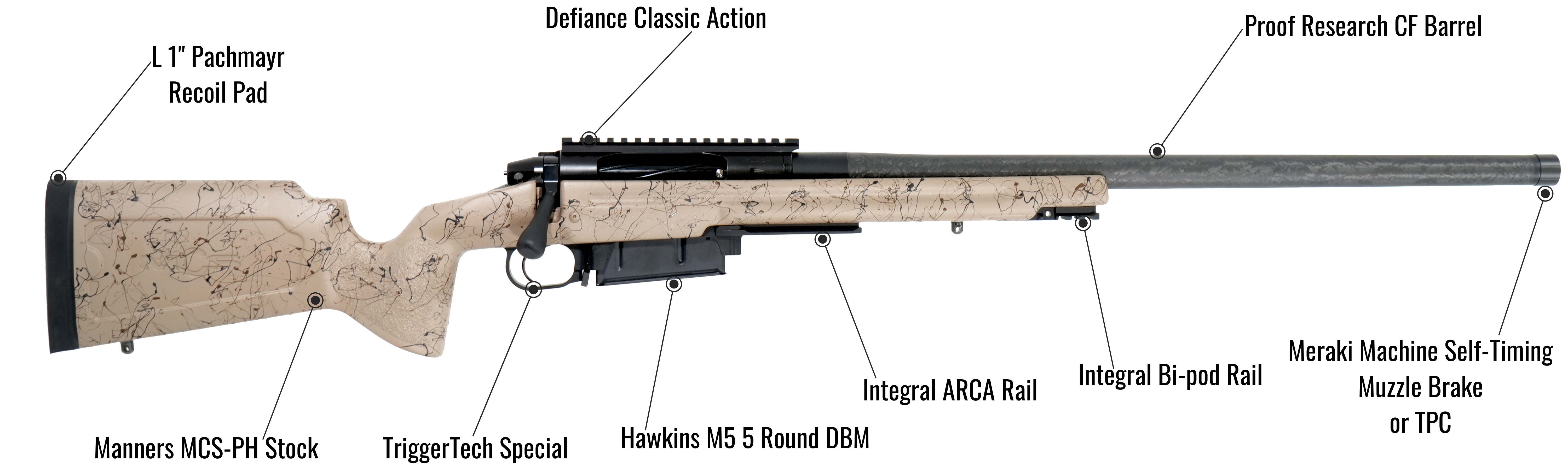 The Carbon Hunter combines the precision of the Defiance Action, Proof Carbon Fiber barrel, with the light weight, snag-free design of the Manners Composite Stocks Pro Hunter (MCS-PH) or the McMillan Mountain Tracker Stock. We use a one-to-one aluminum pillar and full glass-bedding system to ensure perfect alignment and sub-½-MOA accuracy with factory hunting ammo.
