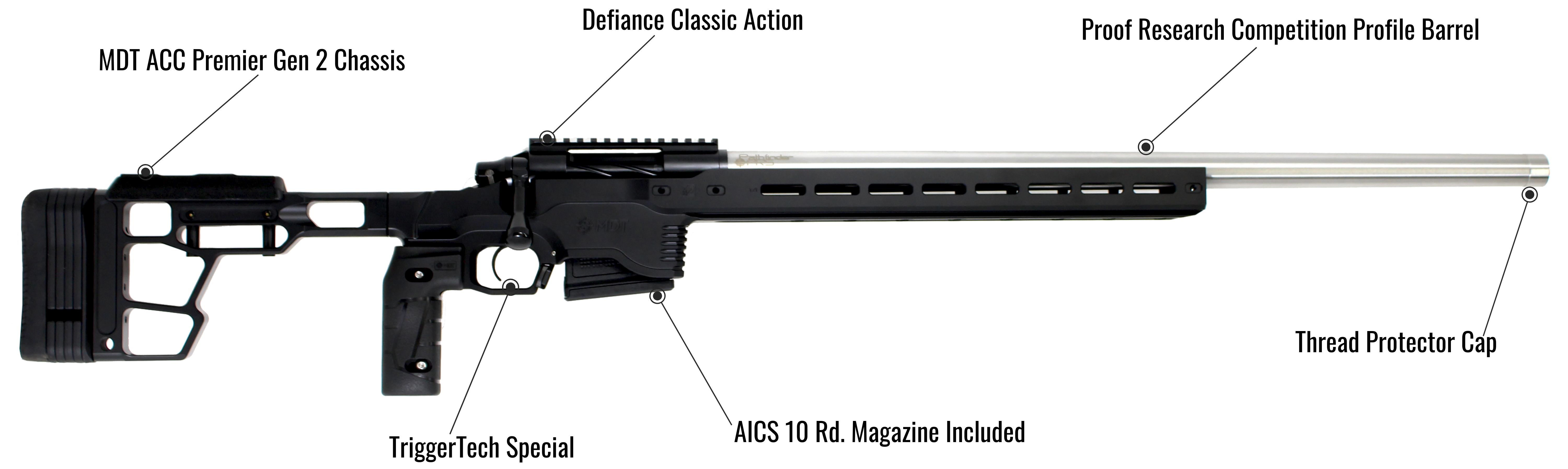 Your next PRS Rig with CONFIDENCE BUILT IN! Our Pathfinder PRS Rifle is built perfectly for Open Division PRS matches. Or use it for some fun plate plinking or as an extremely accurate prairie dog rifle! Built on the outstanding Defiance Machine Classic Heavy action with Trigger Tech trigger, MDT Chassis, Proof Research steel match grade barrel, and our decades of rifle building expertise. Built on the outstanding Defiance Machine Classic Heavy action with Trigger Tech trigger, MDT Chassis, Proof Research steel match grade barrel, and our decades of rifle building expertise.
