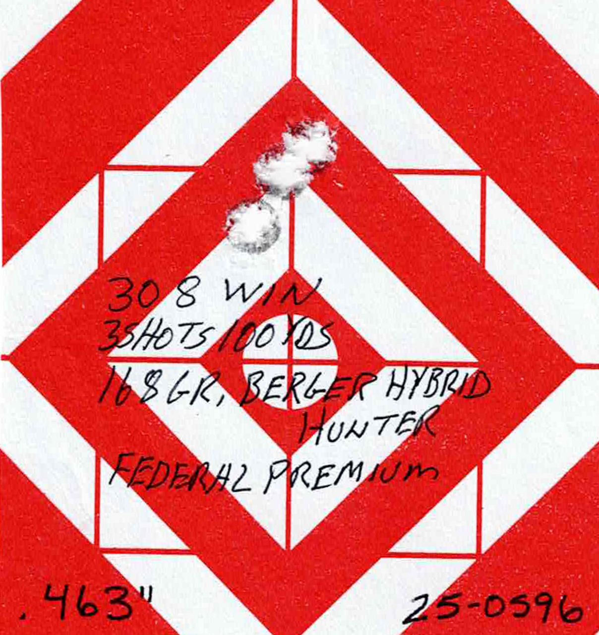 Group Size: .463” with 168gr Berger Hybrid Hunter Federal Premium Ammo
