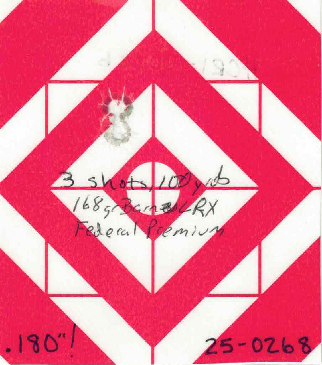 - Group Size: .180" with 168gr Barnes LRX Federal Premium Ammo