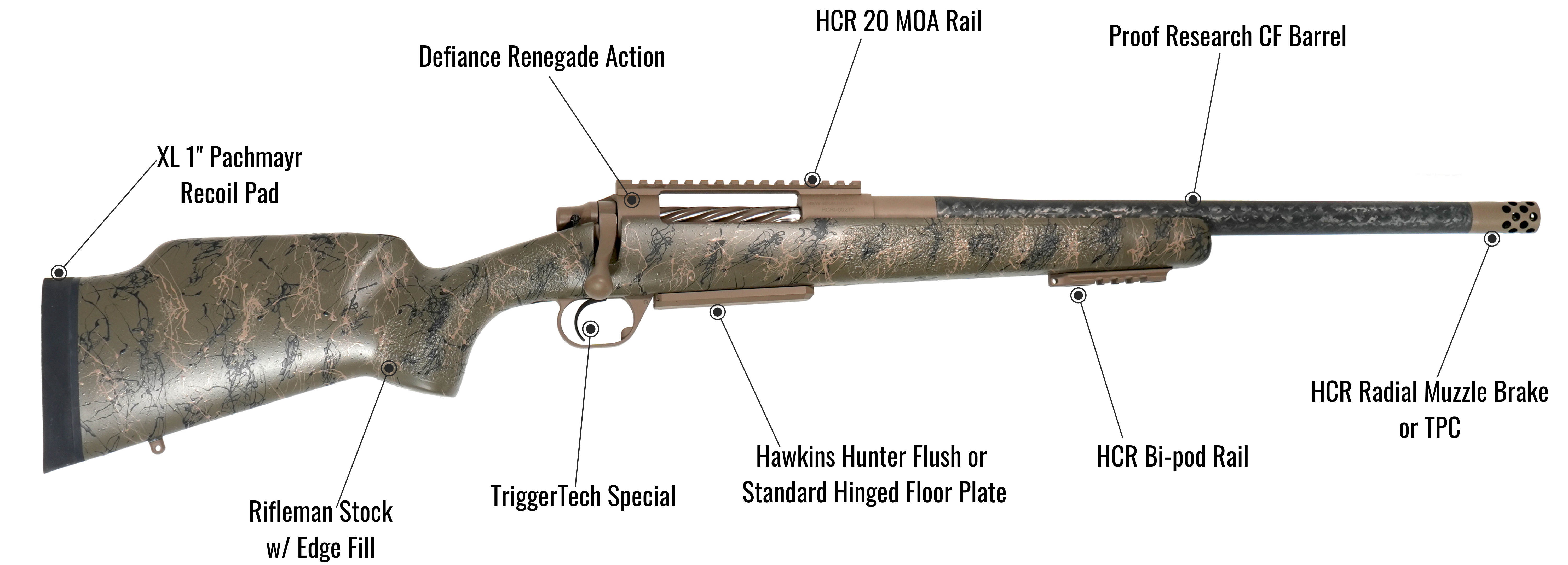 Our Custom Carbon Rifleman combines a Defiance Renegade action with a Proof Research carbon-fiber barrel and our proprietary Rifleman stock with carbon fiber shell to deliver serious precision in a sleek, rugged package. Our Rifleman stock features the best blend of grip shape, comb height, and forearm dimensions of any long range hunting stock on the market. We use a one-to-one aluminum pillar and full glass-bedding system to ensure perfect alignment and sub-½-MOA accuracy with factory hunting ammo.