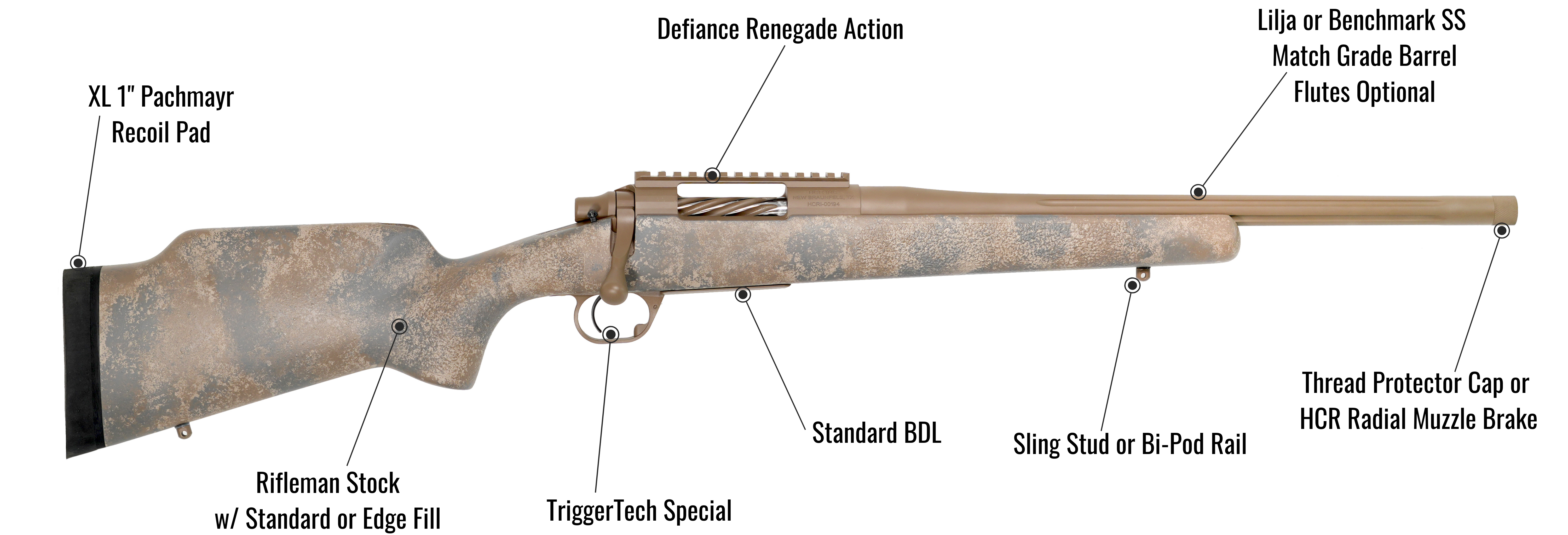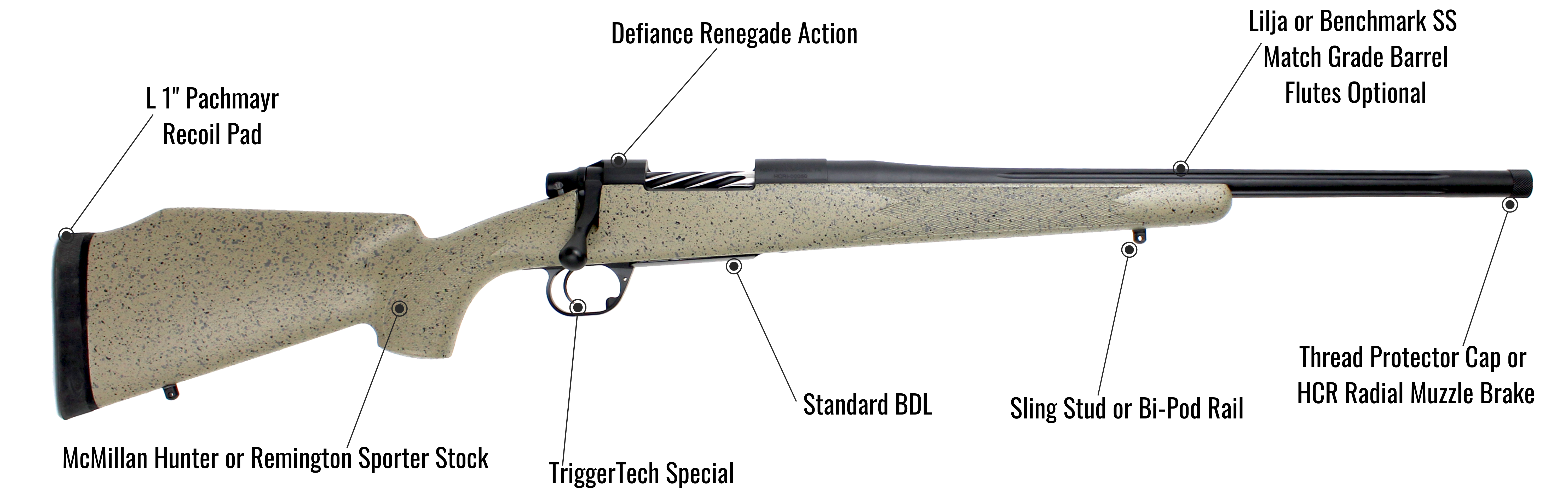 Typical rifle weight: 7.5lbs to 9.0lbs Unscoped. Available in Right and Left Hand Configurations.