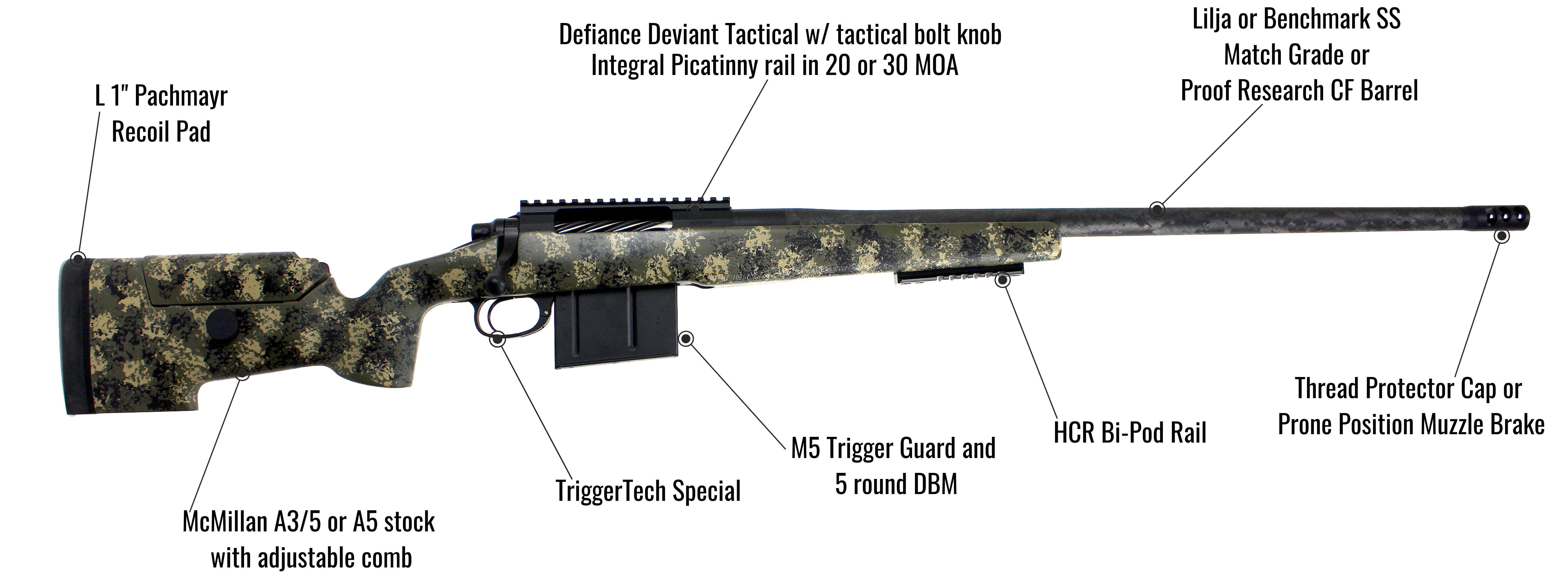 Your next PRS Rig with CONFIDENCE BUILT IN! Our Pathfinder PRS Rifle is built perfectly for Open Division PRS matches. Or use it for some fun plate plinking or as an extremely accurate prairie dog rifle! Built on the outstanding Defiance Machine Classic Heavy action with Trigger Tech trigger, MDT Chassis, Proof Research steel match grade barrel, and our decades of rifle building expertise. Built on the outstanding Defiance Machine Classic Heavy action with Trigger Tech trigger, MDT Chassis, Proof Research steel match grade barrel, and our decades of rifle building expertise.