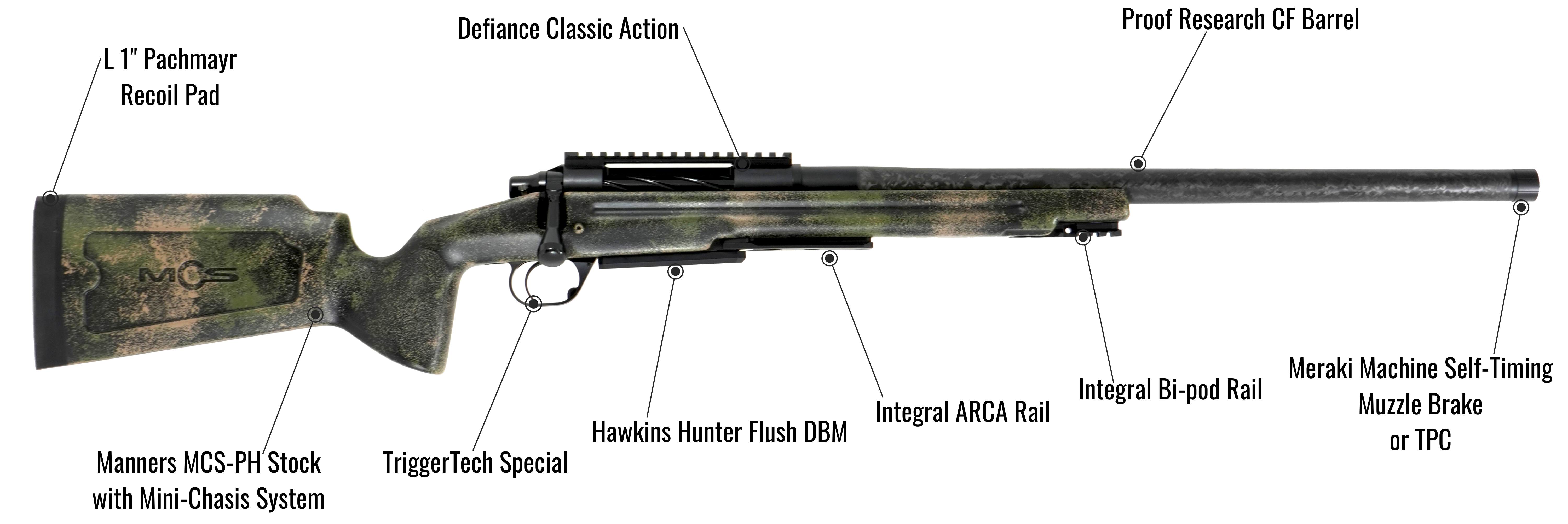 The Carbon Hunter combines the precision of the Defiance Action, Proof Carbon Fiber barrel, with the light weight, snag-free design of the Manners Composite Stocks Pro Hunter (MCS-PH) or the McMillan Mountain Tracker Stock. We use a one-to-one aluminum pillar and full glass-bedding system to ensure perfect alignment and sub-½-MOA accuracy with factory hunting ammo.