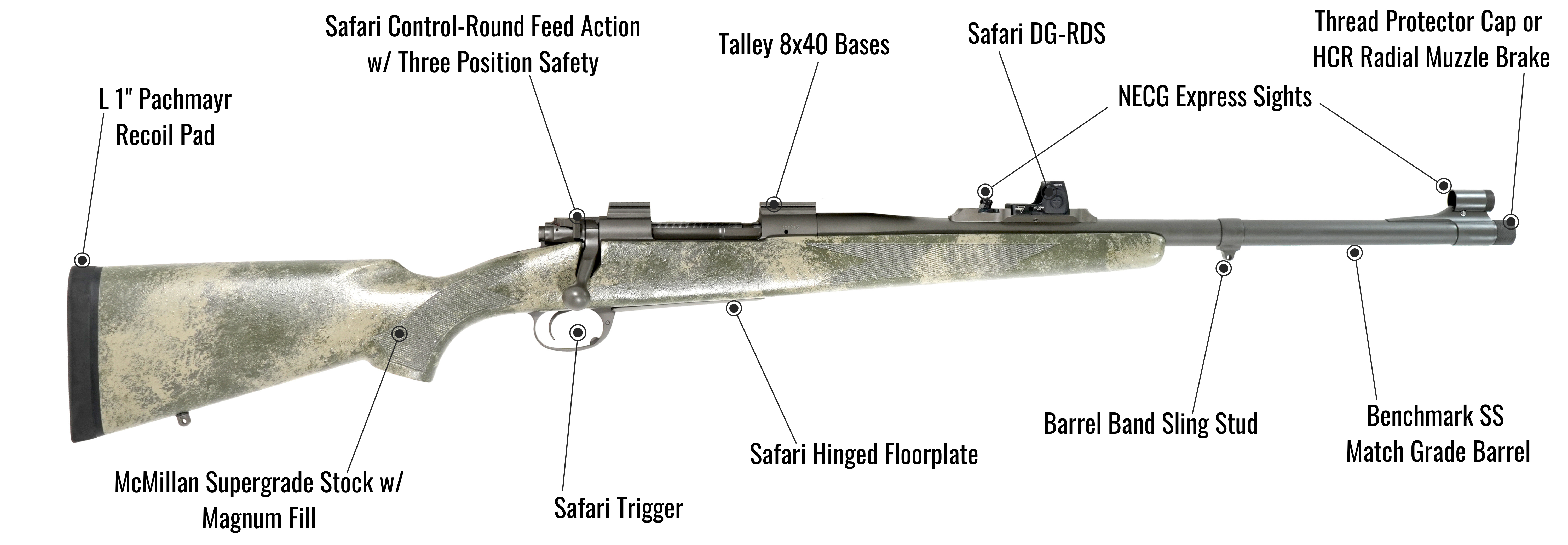 Each rifle is aluminum pillar and glass bedded into a durable McMillan Supergrade stock and rigorously tested for function, feeding, and accuracy—backed by our accuracy guarantee with the appropriate factory ammunition for your hunt.