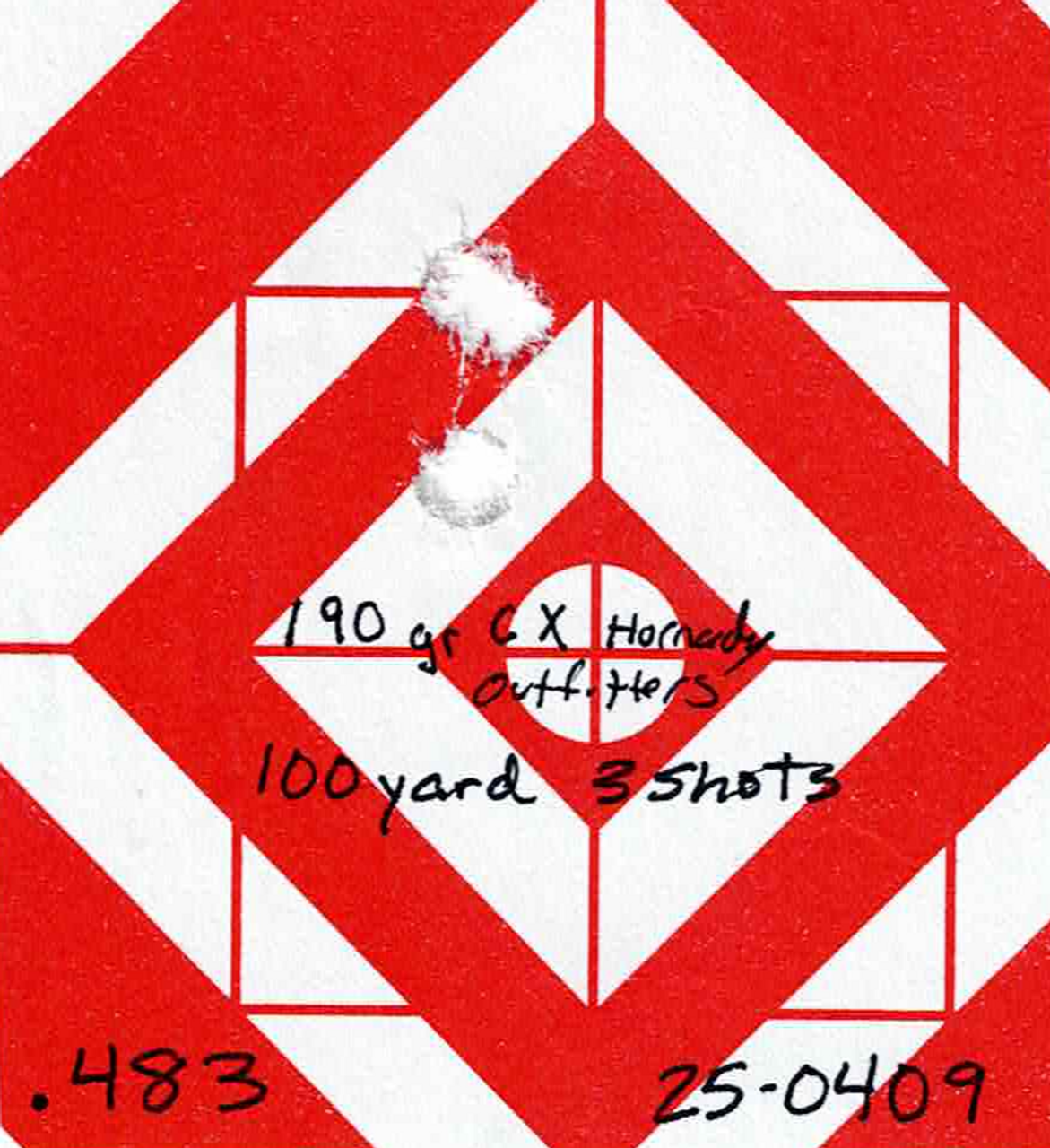 Group Size: .483” with 190 CX Hornady Outfitter Ammo