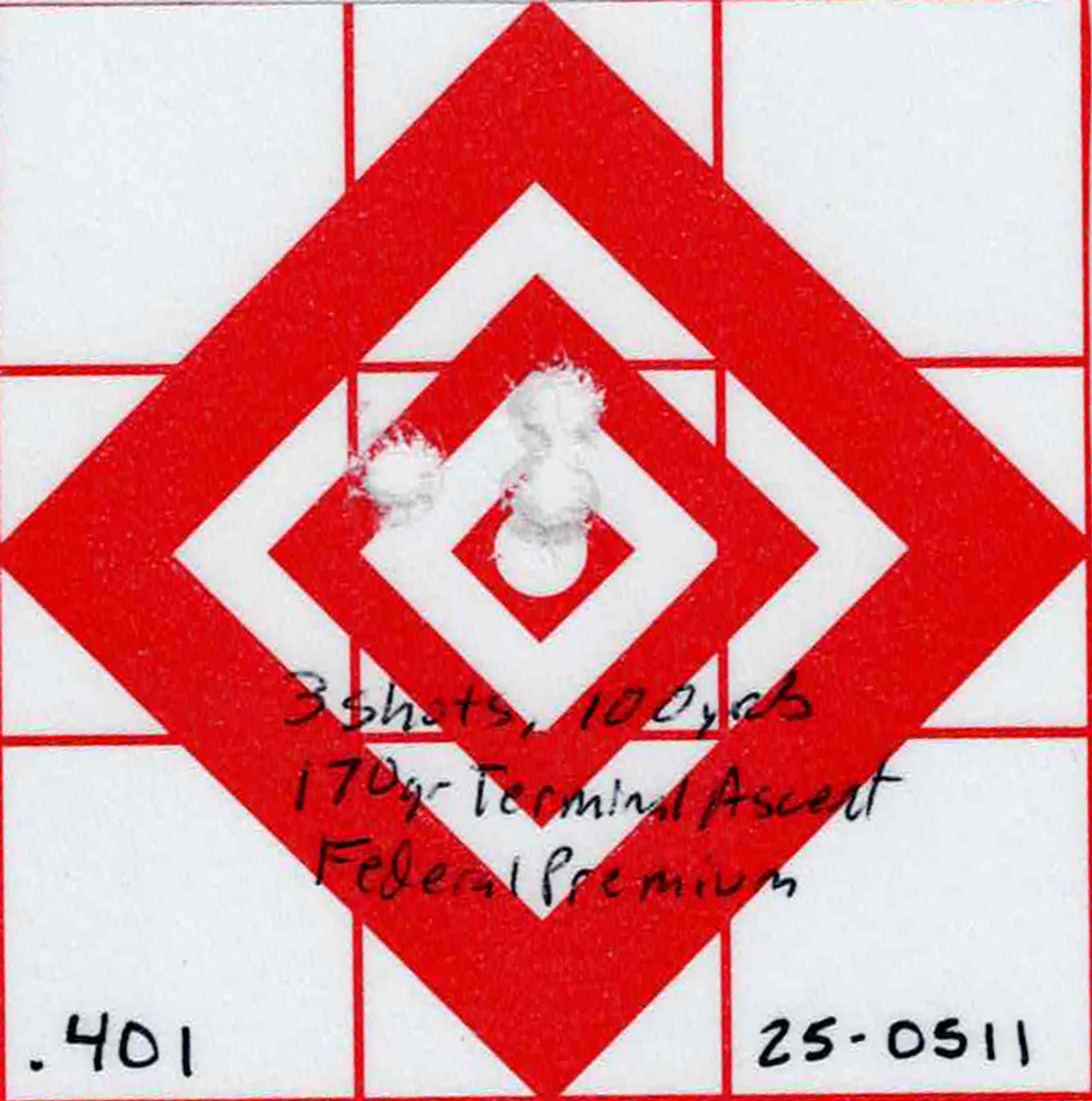 Group Size: .401" with 170gr Terminal Ascent Federal Premium