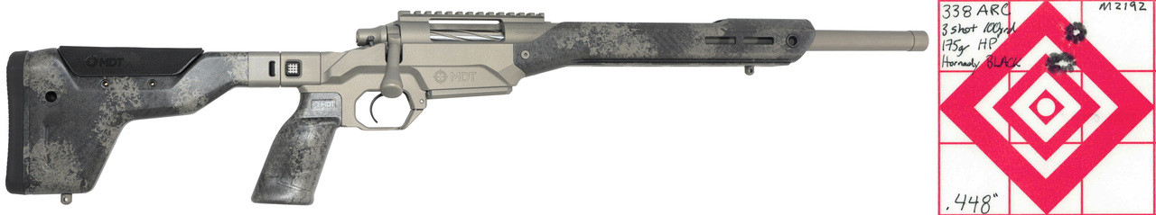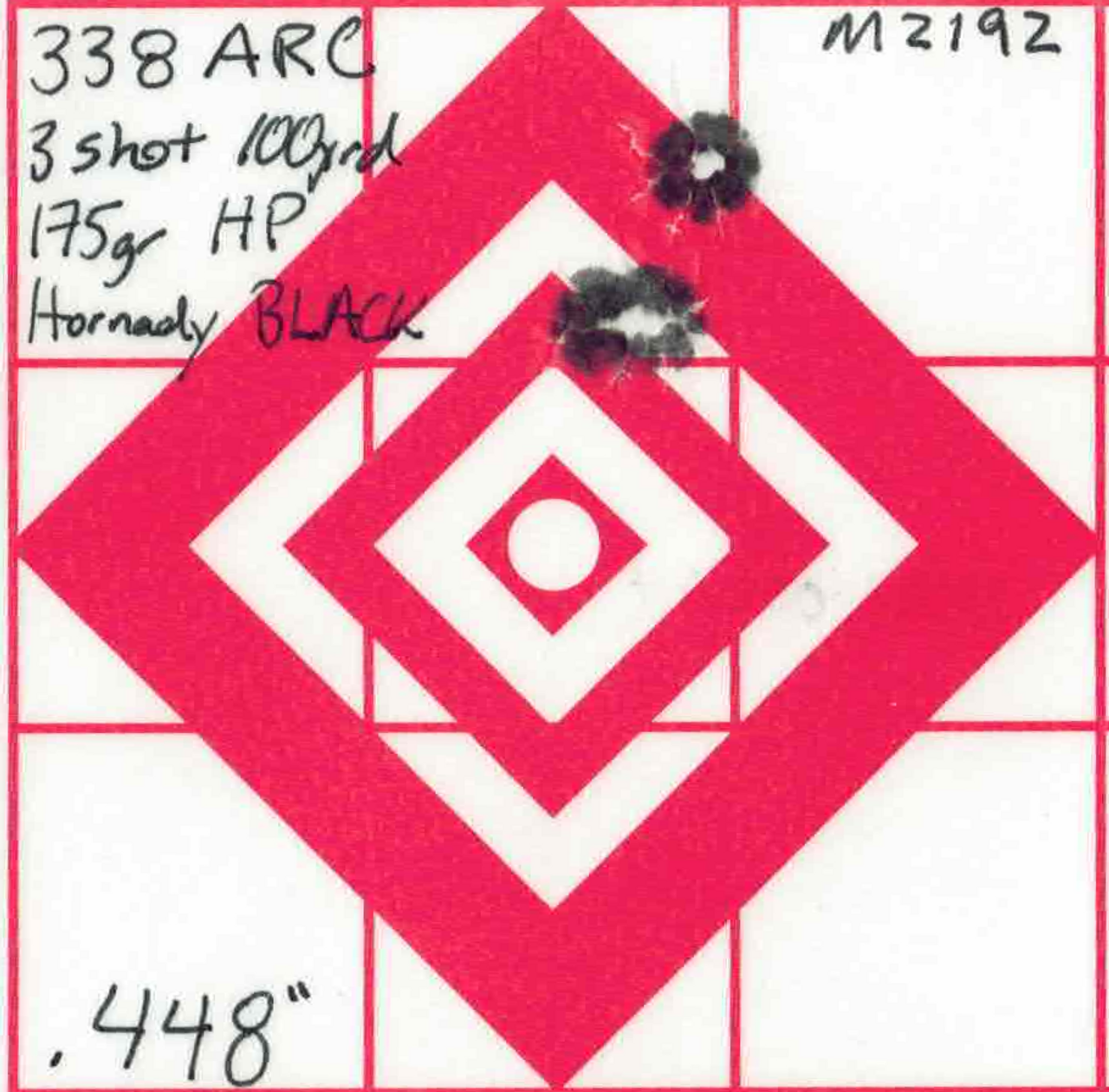 If you are not already familiar with the 338 ARC, look into it. It corrects the main issue with the 300 Blackout; the 338 ARC actually has knock-down power! The 338 ARC subsonic ammo uses a massive 307 grain, Sub-X bullet with almost twice the energy of the 300 Blackout. The Sub-X bullet is designed to penetrate and expand at subsonic velocity, so when you shoot pigs, they don’t all run off. The supersonic ammo uses a .338 caliber, 175 grain hollow point going just North of 2000 fps in our 16.5” barrel. That gives you a pretty decent trajectory out to 200 yards.