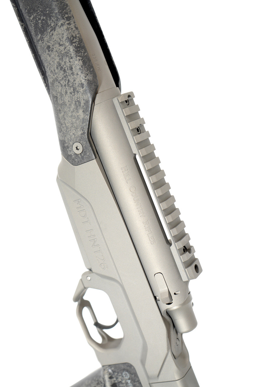MDT Carbon Hunt 26 stock with folding butt stock. Fully extended, the rifle is only 35.5 inches long. With the butt stock folded it is a very compact 27.5” in length. The stock comb and length of pull are fully adjustable so kids and adults can both shoot it. This build features Custom Champagne Dark Earth Cerakote color, and the Specter Carbon Mirage paint that allows some of the carbon fiber stock material to show through.